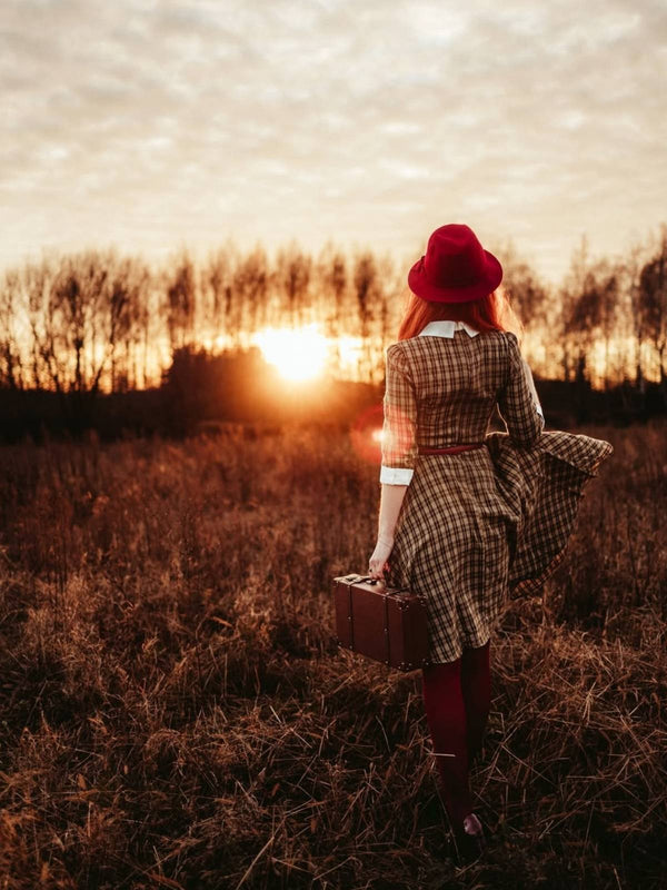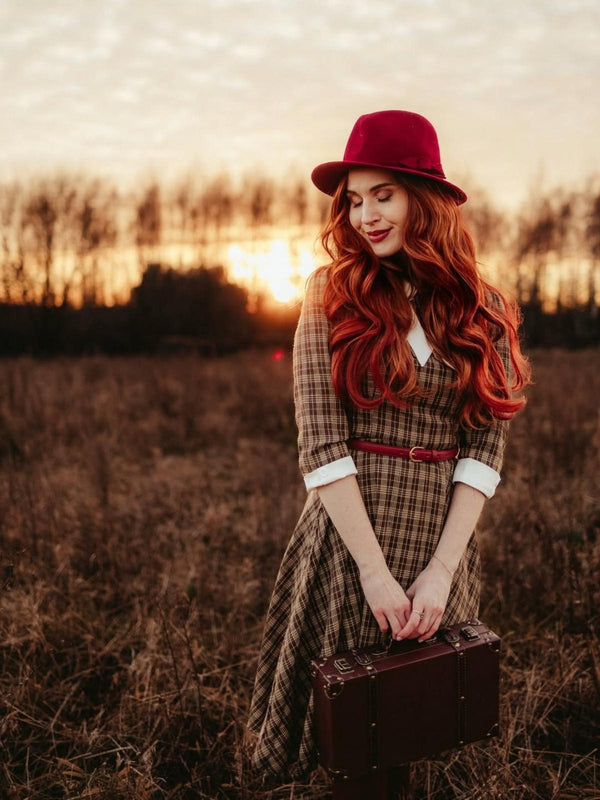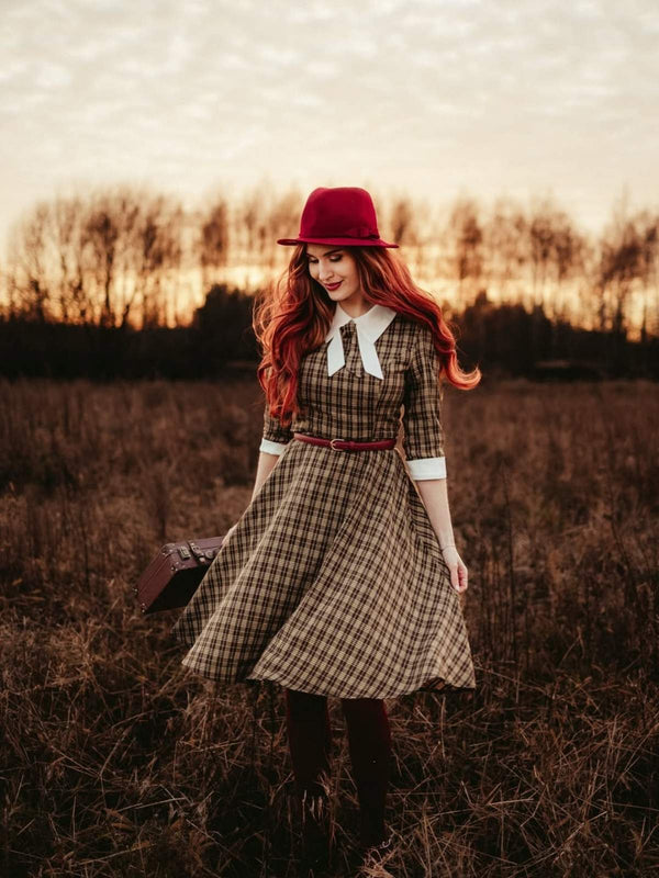 Robe à carreaux marron à revers et nœud des années 1950 – Retro Stage-France